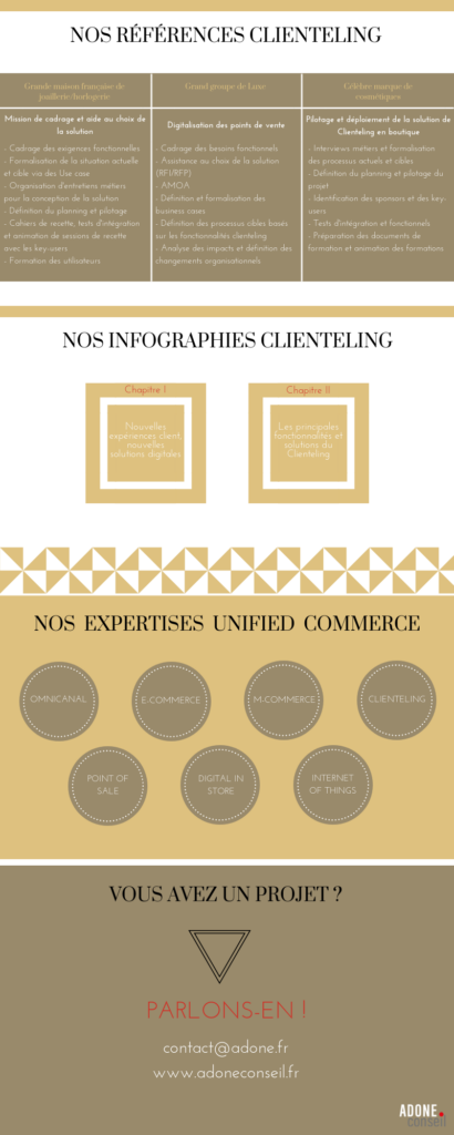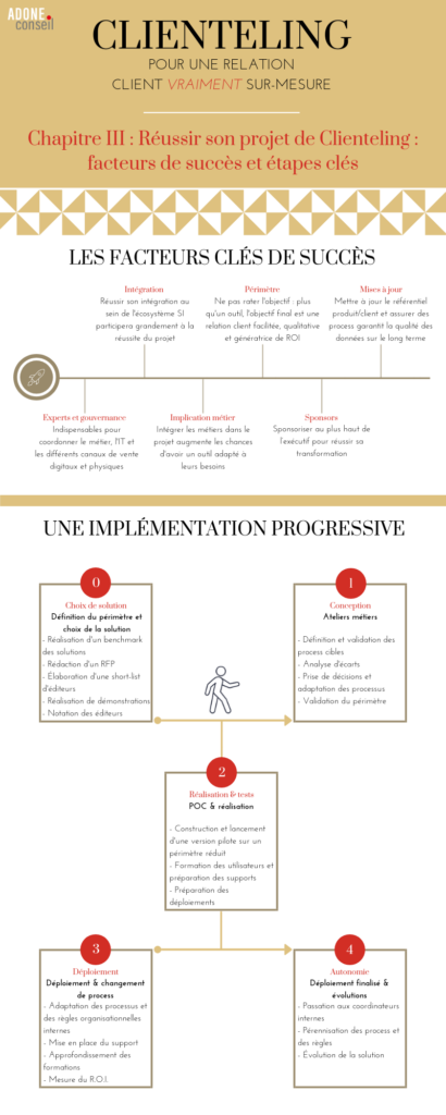 Dans ce troisième et dernier chapitre de notre série d’infographies consacrées au Clienteling, nous vous donnons les facteurs de succès et les étapes clés de la mise en place d’un projet Clienteling.