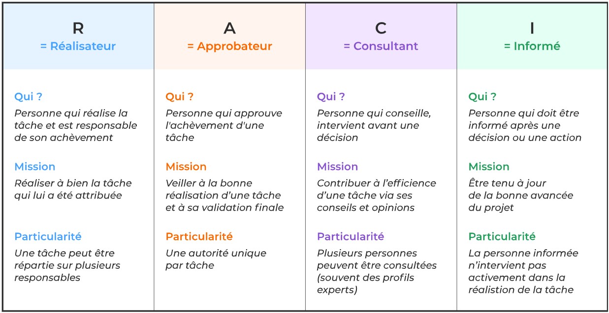 Dans un premier temps, il est essentiel d’identifier et définir le rôle et les responsabilités de chacun des acteurs d’un projet d’implémentation grâce à un RACI. Cette matrice est un outil de gestion de projet dont l’acronyme signifie :