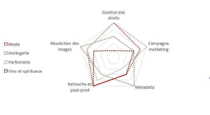 Que ce soit pour les projets PIM ou les projets DAM, tous ces secteurs ont des spécificités communes mais avec un degré d’importance variable comme vous pouvez le constater avec les graphiques radar ci-dessous.