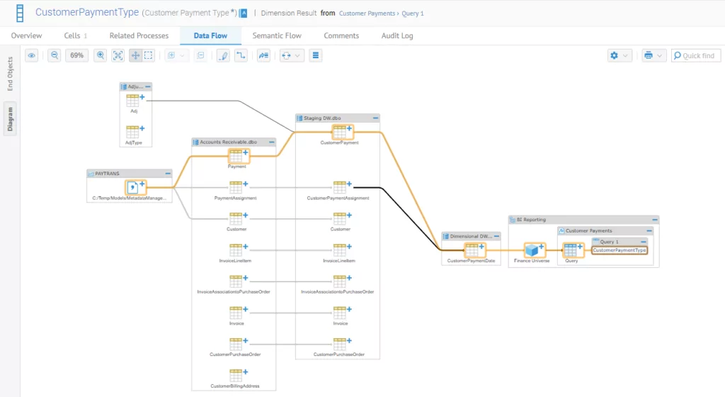 Il peut être intéressant de comprendre d’où vient la donnée qui nous intéresse et d’identifier les transformations qu’elle a subies. Le Data Lineage permet d’accéder à cette information ; ce processus permet en effet de visualiser le flux de la donnée et les différentes transformations qui l’ont impactée (agrégation, changement de format, etc.).
