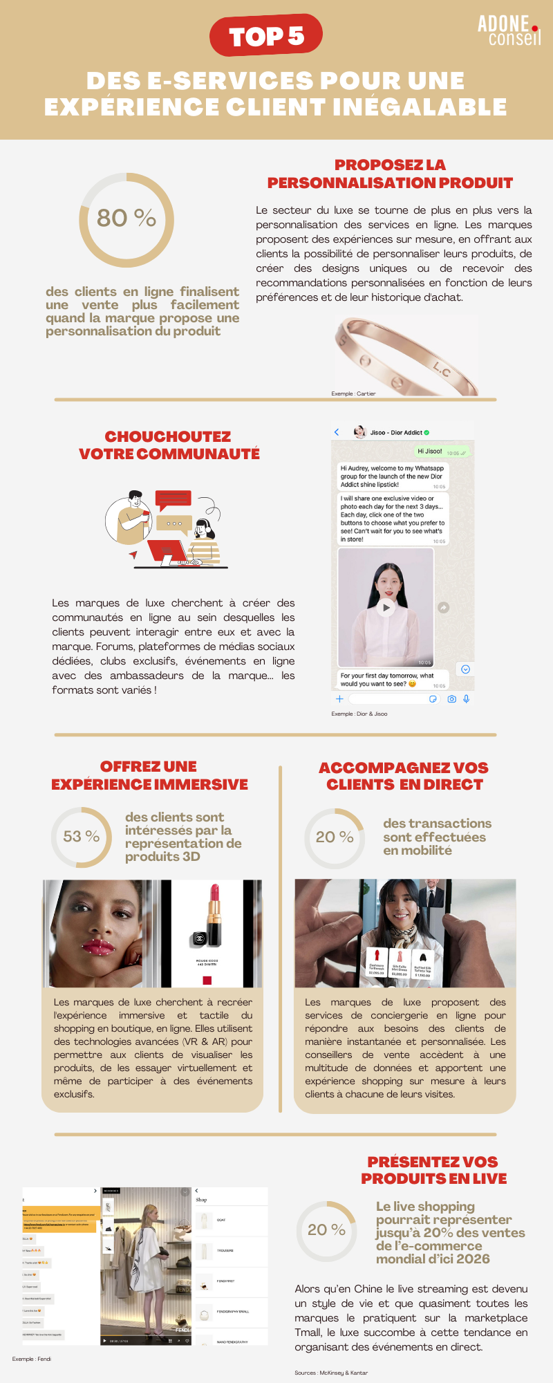 Les marques de luxe proposent des services de conciergerie en ligne pour répondre aux besoins des clients de manière instantanée et personnalisée. Les conseillers de vente accèdent à une multitude de données et apportent une expérience shopping sur mesure à leurs clients à chacune de leurs visites.
