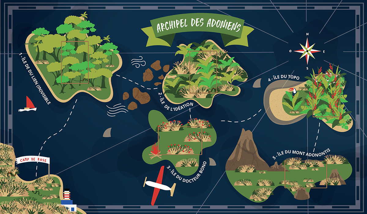 Pendant deux heures, les participants vont réveiller l’explorateur qui sommeille en eux et partir à l’aventure au cœur de l’archipel des Adoniens ! Cet ensemble d’îles relativement proches les unes des autres, a été créé par la pensée et les actions des Adoniens. Cela a donné un ensemble composé de 5 îles que les joueurs vont devoir traverser.