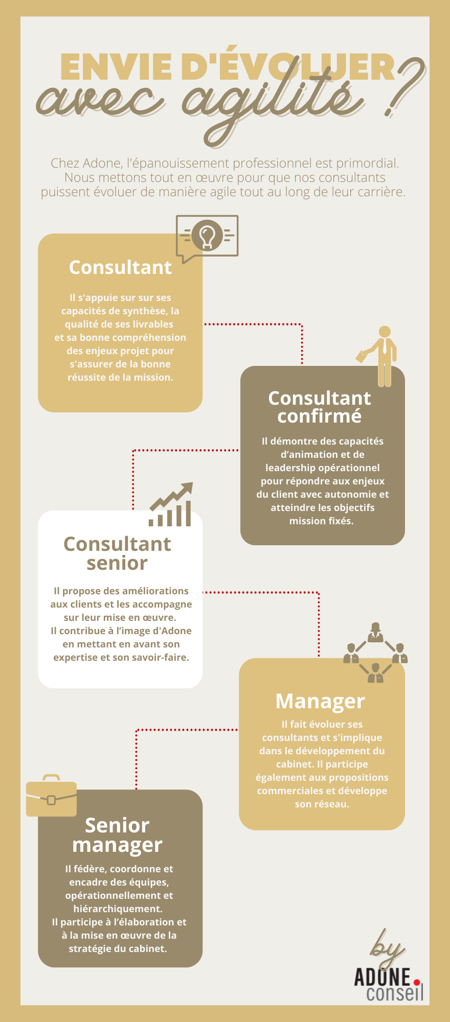 De consultant confirmé à consultant senior, de manager à senior manager… vous aussi, vous souhaitez évoluer avec agilité ? L’infographie ci-dessous retrace les possibilités d’évolution qui s’offrent à vous en rejoignant Adone!