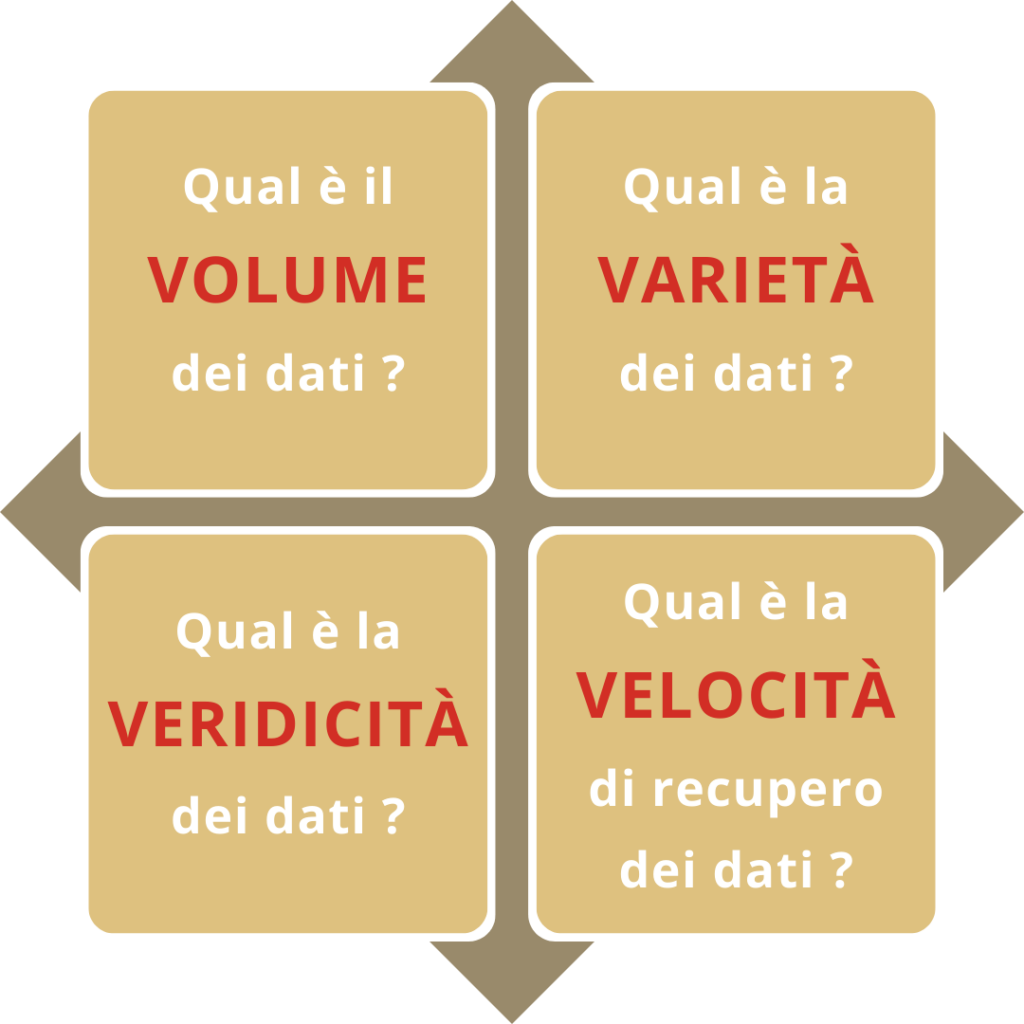 Il volume contribuirà a determinare l’architettura da realizzare e le tecnologie da utilizzare. Non implementeremo lo stesso sistema per 1MB di dati e per 10TB e non sceglieremo le stesse tecnologie. Per 1Mb di dati, non utilizzeremo necessariamente Hadoop. ( Framework per la distribuzione dello storage dei dati) Inoltre non sceglieremo lo stesso database, ecc…. - Qual è la VARIETÀ dei miei dati ? (canali di recupero dei dati sorgente)