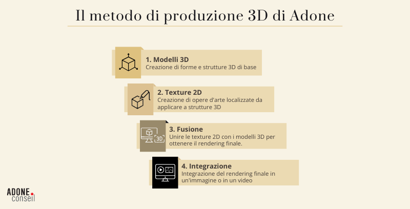 L’idea generale è generare visual tramite una catena completamente digitale, senza alcuna fase di fotografia dei prodotti. I prodotti vengono modellati in 3D, gli artwork 2D (etichette, packaging, colori, ecc.) vengono applicati al modello 3D e i file finali sono generati fondendo gli asset 3D e 2D.