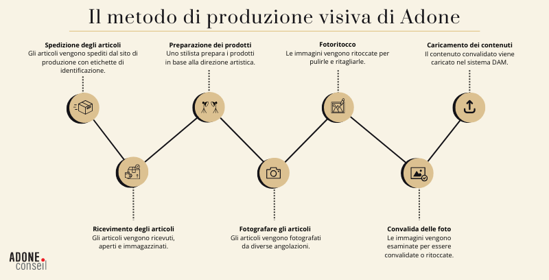 L’idea generale è passare ad un processo di scatto manuale/artigianale a un processo industriale o semi-industriale, in particolare tramite l’utilizzo di banchi fotografici con piatto rotante. Il tempo dedicato alla preparazione e fotografia dei prodotti si riduce considerevolmente.