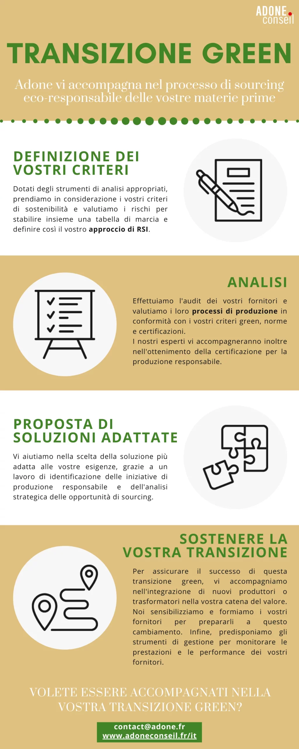 Definizione dei vostri criteri, analisi, proposta di soluzioni adatte, accompagnamento della vostra transizione: scoprite nell’infografica qui sotto la nostra metodologia per aiutarvi nel sourcing eco-responsabile delle vostre materie prime.
