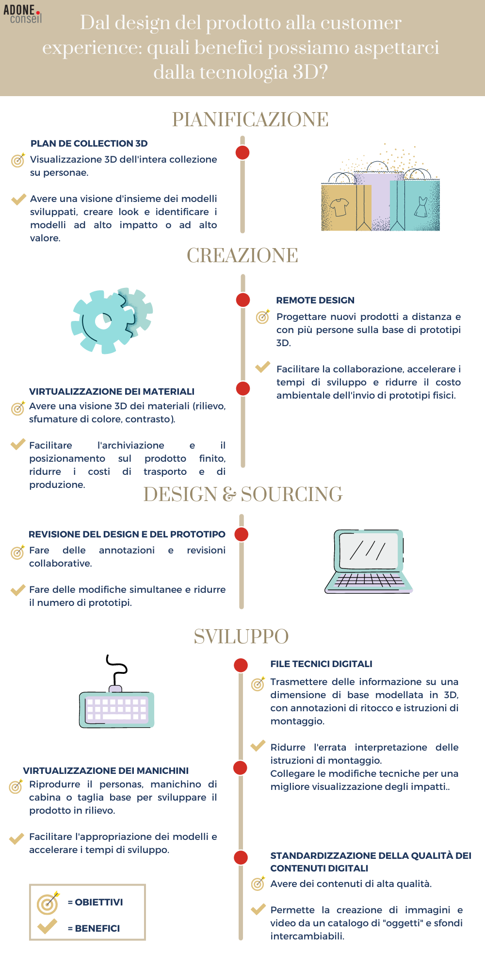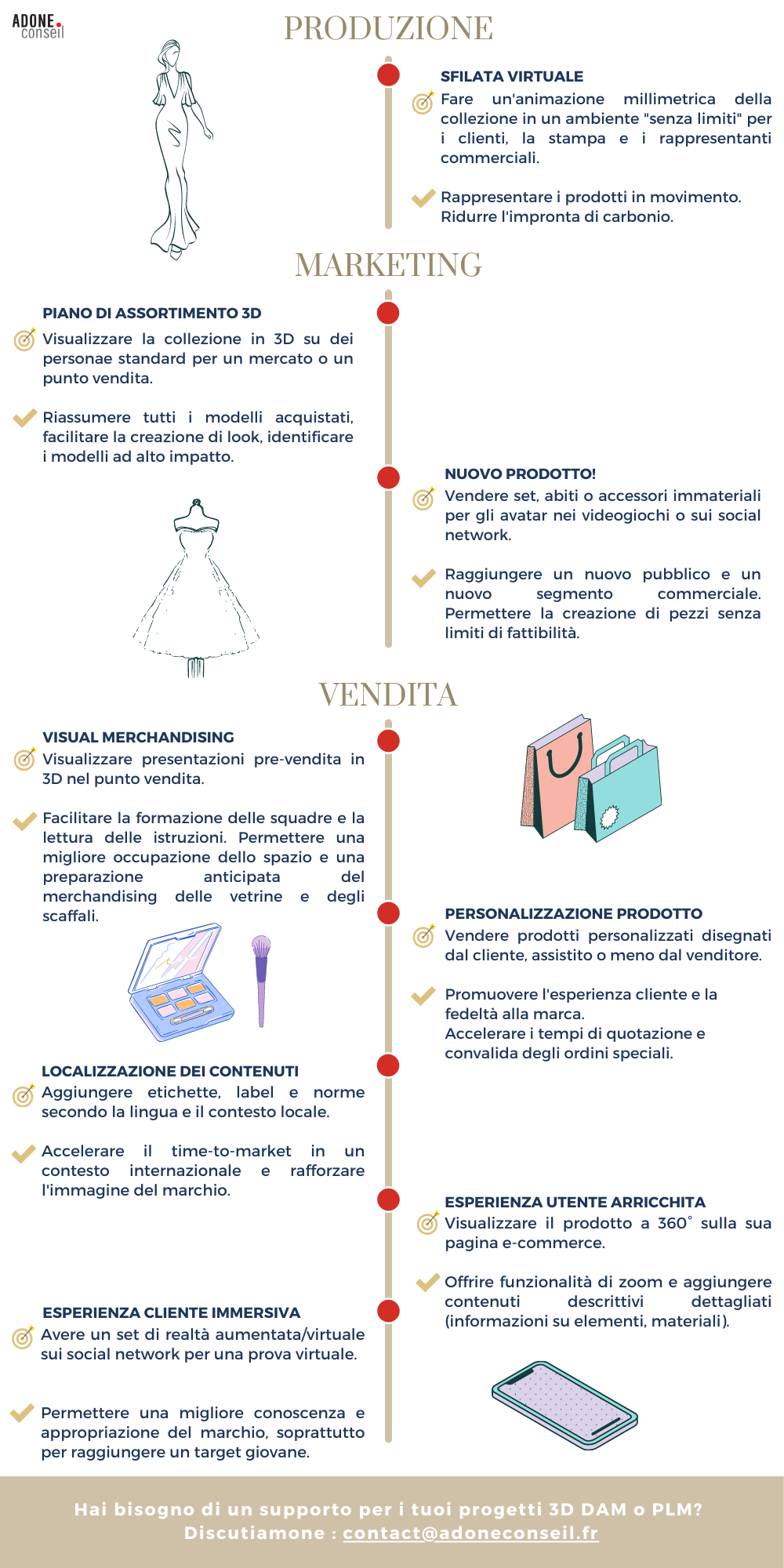 La creazione di modelli 3D permette di generare un prodotto in tutte le sue angolazioni. Facilita così la capacità degli utenti di visualizzare il prodotto nelle sue proporzioni, in un ambiente realistico con la possibilità di zoomare sui dettagli. Mentre l’implementazione del 3D ha un ovvio costo e un impatto sulle organizzazioni, contribuisce anche a raggiungere delle economie di scala, sviluppare nuove abitudini di lavoro, di consumo e ad accelerare significativamente il time-to-market. Siete tentati dall’esperienza ma non sapete da dove cominciare? Scoprite, attraverso la nostra infografica, diversi casi di applicazione che interessano maggiormente i nostri clienti.