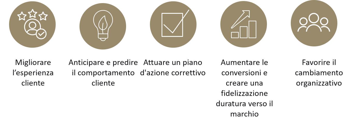 - Aumentare la soddisfazione dei clienti captando i segnali attraverso un’analisi approfondita dei dati (transazionali, emotivi e comportamentali) e ascoltando i clienti per identificare bisogni e aspettative.